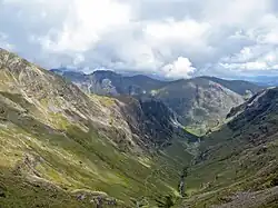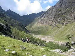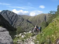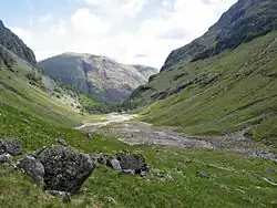 Coire Gabhail (Corrie of the Bounty,[1] or The Hollow of Capture[2]) is a high level glen in the Bidean nam Bian mountain massif to the south of Glen Coe, Highland, Scotland. Its narrow entrance 230 metres (750 ft) up the hillside conceals the width of the glen beyond, and it is commonly known as the Hidden Valley or Lost Valley of Glencoe. Access from a bridge crossing the River Coe is by a steep path up beside a narrow wooded ravine.[3][4]