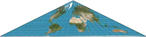 This formula gives the projection as pictured above, coming to a point at the North Pole. For a projection coming to a point at the South Pole, as in the bottom portion of the HEALPix projection, replace φ and y with -φ and -y. The standard parallel is 15°51′N.