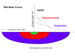 Burgess's work helped generate the bid rent curve. This theory states that the concentric circles are based on the amount that people will pay for the land. This value is based on the profits that are obtainable from maintaining a business on that land. The center of the town will have the highest number of customers so it is profitable for retail activities. Manufacturing will pay slightly less for the land as they are only interested in the accessibility for workers, 'goods in' and 'goods out'. Residential land use will take the surrounding land.