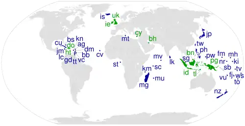 Map of island countries: these states are often grouped geographically with a neighboring continental landmass.