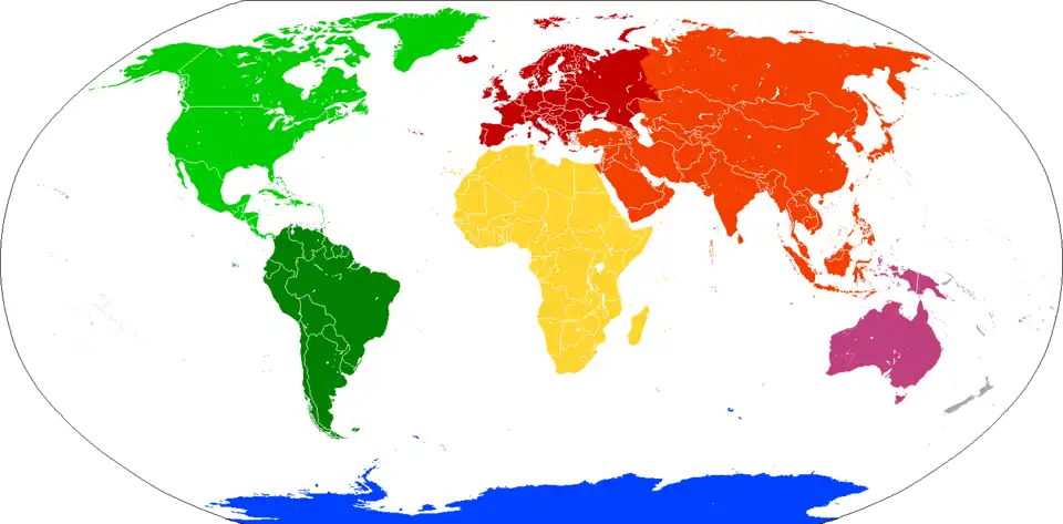 Africa   Asia   Europe    America   Antarctica   Australia [37] UNSD continental regions