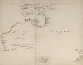 In 1501, Amerigo Vespucci and Gonçalo Coelho attempted to sail around what they considered the southern end of the Asian mainland into the Indian Ocean, passing through Fernando de Noronha. After reaching the coast of Brazil, they sailed along the coast of South America much farther south than Asia was known to extend, confirming that this was a land of continental proportions.[97] On return to Europe, an account of the voyage, called Mundus Novus ("New World"), was published under Vespucci's name in 1502 or 1503,[98] although it seems that it had additions or alterations by another writer.[99] Regardless of who penned the words, Mundus Novus credited Vespucci with saying, "I have discovered a continent in those southern regions that is inhabited by more numerous people and animals than our Europe, or Asia or Africa",[100] the first known explicit identification of part of the Americas as a continent like the other three.