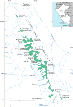 The Cordillera Blanca (Spanish for "white range") is a mountain range in Peru that is part of the larger Andes range and extends for 200 kilometres (124 mi) between 8°08' and 9°58'S and 77°00' and 77°52'W, in a northwesterly direction.[1] It includes several peaks over 6,000 metres (19,690 ft) high and 722 individual glaciers.[1] The highest mountain in Peru, Huascarán, at 6,768 metres (22,205 ft) high, is located there.[1][2]