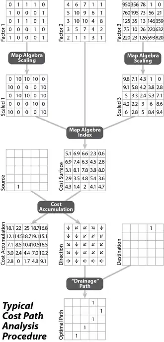 - Accumulation: Starting at the source location compute the lowest total cost needed to reach every other cell in the grid. Although there are several algorithms, such as those published by Eastman and Douglas,[8][9] they generally follow a similar strategy.[13] This process also creates, as an important byproduct, a second raster grid usually called the backlink grid (Esri) or movement direction grid (GRASS), in which each cell has a direction code (0-7) representing which of its eight neighbors had the lowest cost.