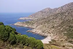 The coast was named Costa Brava by Ferran Agulló i Vidal in an article published in the Catalan newspaper La Veu de Catalunya in September 1908. Agulló, a journalist born in Girona, referred to the rugged landscape of the Mediterranean coast between the Tordera river, near Blanes, and Banyuls (just over the border in France) with the name Costa Brava.[1][2] Costa is the Catalan and Spanish word for 'coast', while Brava in both languages means 'rugged' or 'wild'.[3] This term was officially recognized and promoted in the 1960s as it was deemed suitable to promote tourism in the region.[4] Before Costa Brava became the official name, other names were suggested, such as Costa Grega (Greek Coast) due to the ancient heritage of this area which includes Greek-Phoenician settlements such as Emporion, Costa del Corall (Coral Coast), Costa Serena (Serene Coast), Costes de Llevant (Levant Coasts) or Marina de l'Empordà (Empordà Marine).[5]