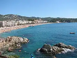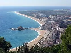 The southernmost part of the Costa Brava belongs to the comarca of Selva, whose capital is Santa Coloma de Farners, about 20 kilometres (12 mi) from the Mediterranean Sea. Tossa de Mar is located to the north of the coastline, with several resorts and small bays along the littoral. Lloret de Mar, located to the south of Tossa, is the largest resort on the Costa Brava, with a population of over 200,000 at its peak during the summer. Blanes is the southernmost town on the Costa Brava and is the third most populous municipality of the Province of Girona.[6]