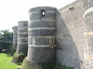 Geoffrey's son Fulk the Black (21 July 987 – 21 June 1040) gained fame both as a warrior and for the pilgrimages he undertook to the Holy Sepulchre in Jerusalem to atone for his deeds.[5] He found himself confronted on his accession with a coalition of Counts Odo I of Blois and Conan I of Rennes. The latter having seized upon Nantes, of which the counts of Anjou held themselves to be suzerains, Fulk came and laid siege to it, routing Conan's army at the battle of Conquereuil (27 June 992) and re-establishing Nantes under his own suzerainty. Then turning his attention to the count of Blois, he proceeded to establish a fortress at Langeais, a few miles from Tours, from which, thanks to the intervention of King Hugh Capet, Odo failed to oust him.