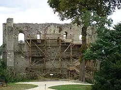 Another rising was crushed in 1134 by the destruction of Cand and the taking of L'Île Bouchard. In 1136, while the count was in Normandy, Robert III of Sablé put himself at the head of the movement, to which Geoffrey responded by destroying Briollay and occupying La Suze; and Robert of Sablé himself was forced to beg humbly for pardon through the intercession of the bishop of Angers. In 1139 Geoffrey took Mirebeau, and in 1142 Champtoceaux, but in 1145 a new revolt broke out, this time under the leadership of Elias, the count's own brother, who, again with the assistance of Robert of Sablé, laid claim to the countship of Maine. Geoffrey took Elias prisoner, forced Robert of Sablé to beat a retreat, and reduced the other barons to reason. In 1147 he destroyed Doué and Blaison. Finally in 1150 he was checked by the revolt of Giraud, Lord of Montreuil-Bellay; for a year he besieged the place until it had to surrender, and he then took Giraud prisoner and only released him on the mediation of the king of France.[4]