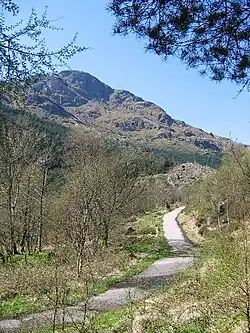 The A83 trunk road crosses the northern end of the peninsular passing Arrochar at the head of Loch Long and Cairndow near the head of Loch Fyne. It partly follows or runs parallel to William Caulfield's historic military road that takes its name, Rest and Be Thankful from the stone seat erected at the summit at the head of Glen Croe. As the A83 has been subject to landslips, the old route has been used as a diversionary route.[22] The other A roads are the A815 which links the A83 with Dunoon via Strachur where the A886 leaves it and heads south via Glendaruel to Colintraive where the ferry connects it to the Isle of Bute and the A8003 which links Tighnabruaich to the A886. Other roads are secondary B roads, narrow roads or tracks.