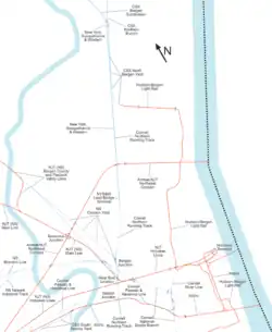 The area is informally named Croxton after Croxton Yard on the Norfolk Southern Freight Line.[3][4] Much of the area is filled with New Jersey Transit commuter lines and freight lines. There are no passenger stations, although Secaucus Junction is nearby. The area is home to the Metropolitan Bulk Mail Facility for New York and New Jersey. The only major road crossing the district is County Road, which connects Jersey City Heights with Secaucus. In 2005, the New Jersey Turnpike opened Exit 15X to allow access to the newly built Secaucus Junction train station, the access road to which acts like a huge U-turn, and dominates the landscape.[5]