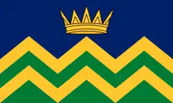The county is represented by the Flag of Cumbria, also known as the Cumbria Community Flag. The design features green and gold chevrons symbolising the county's hills, fells and farmland, a blue field for its lakes, rivers and coastline, and a golden crown representing unity, heritage and civic pride.[77][78]