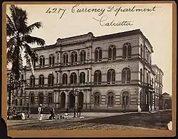 In 1868, the imperial Controller of the Currency converted a large portion of the Currency Building for use by the Office of the Issue and Exchange of Government Currency, after which it became known as the Currency Building.[14][15][16] The Calcutta Mint sent silver coins to the currency office, to maintain a working reserve of currency, while the bulk of India's silver was held in Fort William.[18][19] In addition to issuing and storing coinage, the Indian government also utilized the building for the issue of paper currency.[20] Between 1889 and 1890, the Bengal government improved the building's drainage, as part of its maintenance of Calcutta's civil buildings.[21]