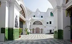 The Currency Building is a three-story brick structure, built in the Italianate style of architecture.[14][19] The building's arched roof is supported by iron joists.[14][20] Its floors are covered by marble and Chunar sandstone.[14][20] The main entrance, in the west-façade, features a three-part gate made of wrought iron,[14] and Venetian windows.[1][20][25] The building's central hall, now an open-air courtyard, was formerly topped by three large domes with skylights.[14][18] During the building's use as a currency office, the central hall contained the exchange counters for banknotes, gold, silver, and small change.[18][19] The second floor contained large, elaborately finished rooms with Italian marble floors.[19] The third floor also featured Italian marble floors, and housed the residence of the assistant commissioner in charge of the currency office.[14][19]