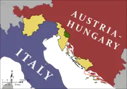 Dalmatia was a strategic region during World War I that both Italy and Serbia intended to seize from Austria-Hungary. Italy joined the Triple Entente Allies in 1915 upon agreeing to the Treaty of London that guaranteed Italy the right to annex a large portion of Dalmatia in exchange for Italy's participation on the Allied side. From 5–6 November 1918, Italian forces were reported to have reached Vis, Lastovo, Šibenik, and other localities on the Dalmatian coast.[64] By the end of hostilities in November 1918, the Italian military had seized control of the entire portion of Dalmatia that had been guaranteed to Italy by the Treaty of London and by 17 November had seized Rijeka as well creating the first Governorate of Dalmatia.[65] In 1918, Admiral Enrico Millo declared himself Italy's Governor of Dalmatia.[65] Famous Italian nationalist Gabriele D'Annunzio supported the seizure of Dalmatia, and proceeded to Zadar in an Italian warship in December 1918.[66] However, in spite of the guarantees of the Treaty of London to Italy of a large portion of Dalmatia and Italian military occupation of claimed territories of Dalmatia, during the peace settlement negotiations of 1919 to 1920, the Fourteen Points of Woodrow Wilson that advocated self-determination of nations took precedence, with Italy only being permitted to annex Zadar from Dalmatia, while the rest of Dalmatia was to be part of Yugoslavia.