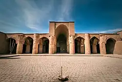 Tarikhaneh and Na'in Mosque in Na'in are the only mosques in the Islamic world which resemble the Medina Mosque. This mosque was built during the eighth century AD by imitating Roman, Byzantine, Iranian and Arabic architecture. This is an Arabic design but the building material and architecture is Sassanid. Originally it was a fire temple during the Sassanid period, and later the mosque was built over its ruins. One column resembling Sassanian architecture at the eastern wing is a proof of this assertion.