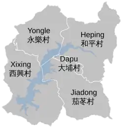 The township comprises five villages: Dapu, Heping, Jiadong, Xixing and Yongle.