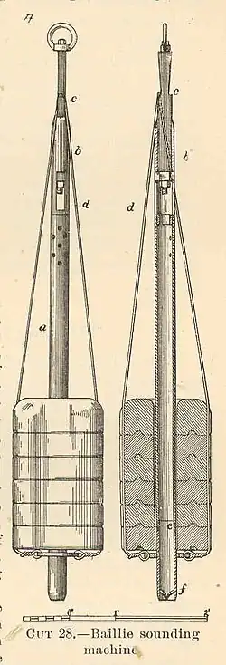 The first instrument used for deep-sea investigation was the sounding weight, used by British explorer Sir James Clark Ross.[4] With this instrument, he reached a depth of 3,700 m (12,139 ft) in 1840.[5] The Challenger expedition used similar instruments called Baillie sounding machines to extract samples from the sea bed.