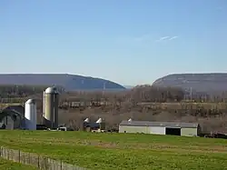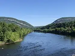 The Delaware Water Gap is a water gap on the border of the U.S. states of New Jersey and Pennsylvania where the Delaware River cuts through a large ridge of the Appalachian Mountains.[2]