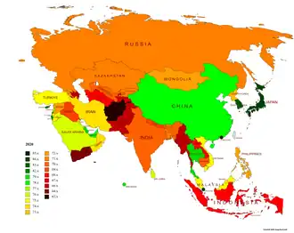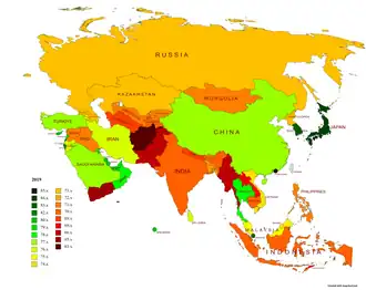 The continent of Asia covers 29.4% of the Earth's land area and has a population of around 4.75 billion (as of 2022),[1] accounting for about 60% of the world population. The combined population of both China and India is estimated to be over 2.8 billion people as of 2022. Asia's population is projected to grow to 5.25 billion by 2055, or about 54% of projected world population at that time.[1] Population growth in Asia was close to 0.55% p.a. as of 2022, with highly disparate rates. Many Western Asian and South Asian countries have growth rates far above the world average, notably Pakistan at 2% p.a., and India with a 0.6% increase in 2022. On the other hand, East Asian nations are in the middle of a demographic stagnation, with China experiencing a small decrease of –0.06%, after years of rapidly slowing growth.