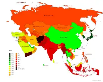 The Human Development Index of Asian countries range from Low to Very High category. The table below shows the 10 highest and lowest countries according to their Human Development Index scores based on the 2021 report.[4]