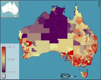 Australia has an average population density of 3.6 persons per square kilometre of total land area, which makes it one of the most sparsely populated countries in the world. This is generally attributed to the semi-arid and desert geography of much of the interior of the country. Another factor is urbanisation—with 89% of its population living in a handful of urban areas, Australia is one of the world's most urbanised countries.[15] The life expectancy of Australia in 2015–2017 was 83.2 years, among the highest in the world.[16]