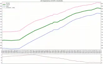 16. ^ "3302.0.55.001 – Life Tables, States, Territories and Australia, 2015–2017". Australian Bureau of Statistics. Retrieved 21 April 2019.