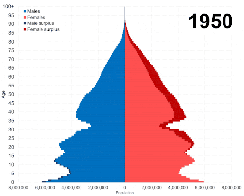 | 1950 | 549,721,718 | 12,202,220 | 6,473,233 | 5,728,987 | 22.2 | 11.8 | 10.4 | -1.6 | 2.70 | 62.8 |