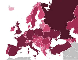 - ^ Population in million: Albania 2.9, Belarus 9.5, Bosnia and Herzegovina 3.5, Iceland 0.3, Moldova 4.1, North Macedonia 2.1, Norway 5.2, Serbia and Kosovo 8.9, Switzerland 8.3, Ukraine 44.7.