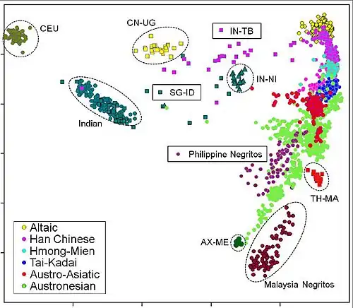 - ^ The HUGO Pan-Asian SNP Consortium; Abdulla, Mahmood Ameen; Ahmed, Ikhlak; Assawamakin, Anunchai; Bhak, Jong; et al. (11 December 2009). "Mapping Human Genetic Diversity in Asia". Science. 326 (5959): 1541–1545. Bibcode:2009Sci...326.1541.. doi:10.1126/science.1177074. ISSN 0036-8075. PMID 20007900. S2CID 34341816.