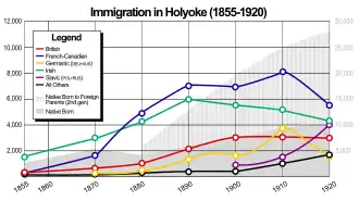 The City of Holyoke has in its history, had a uniquely varied demography for its small population size. In the prime of the Second Industrial Revolution, native-born residents ranged between 18 and 38 percent, as successive waves of Colombian, Dominican, English, French-Canadian, Irish, German, Greek, Italian, Polish, Russian, Puerto Rican, Scottish and many other groups emigrated to Holyoke throughout the city's first century.[3]