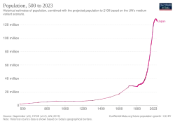 Based on 2012 data from the National Institute of Population and Social Security Research, Japan's population will keep declining by about one million people every year in the coming decades, which would leave it with a population of around 70 million by 2060 and 42 million by early 22nd century if the current projections do not change.[7] More than 40% of the population is expected to be over the age of 65 in 2060.[8] In 2021 the population had for fifteen consecutive years declined by 644,000 on this year, the largest drop on record since 1945 and also reflecting a record low of 831,000 births. As of 2013 more than 20 percent of the population of Japan were aged 65 and over.[9]