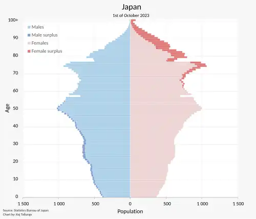 According to a demographic study conducted by Japanese Ministry of Internal Affairs and Communications, the Japanese population (including foreign residents) declined from 128 million people in 2010 to 124.3 million people in 2023, with a decrease of almost 511,000 people in one year.[17][18]