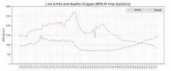 Since 2010, Japan has experienced net population loss due to falling birth rates and minimal immigration, despite having one of the highest life expectancies in the world, at 85.00 years as of 2016 (it stood at 81.25 as of 2006).[5] Using the annual estimate for October of each year, the population peaked in 2008 at 128,083,960 and had fallen by 2,983,352 by October 2021.[6]