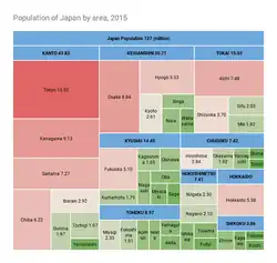 Distribution of population[25] by regions (blue shades) and prefectures (red: most populous; green: less).