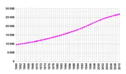 The population of Nepal has been steadily rising in recent decades. In the June 2001 census, there was a population of about 23 million in Nepal.[9] The population increased by 5 million from the preceding 1991 census; the growth rate is 2.3%.[9] The current population is roughly 30 million which contributes to an increase of about 3 million people every 5 years.