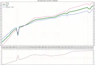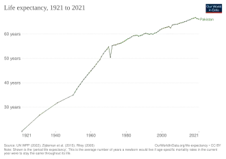 In July 2022, the United Nations published its 2022 World Population Prospects, a bi annually-updated database where key demographic indicators are estimated and projected worldwide down to the country level. They prepared estimates of Pakistan's population for every year from 1950 to 2021, as well as projections for future decades.[4] This data includes Azad Kashmir and Gilgit-Baltistan.