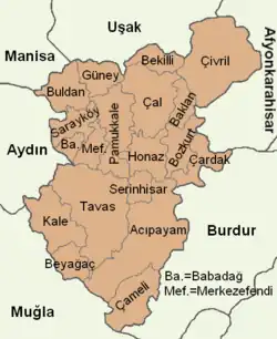 Denizli Province (Turkish: Denizli ili) (Turkish pronunciation: [deniz'ʎi iʎi]) is a province and metropolitan municipality of Turkey in Western Anatolia, on high ground above the Aegean coast. Neighbouring provinces are Uşak to the north, Burdur, Isparta, Afyon to the east, Aydın, Manisa to the west and Muğla to the south. It is located between the coordinates 28° 30’ and 29° 30’ E and 37° 12’ and 38° 12’ N. Its area is 12,134 km2,[4] and its population is 1,056,332 (2022).[3] The provincial capital is the city of Denizli.