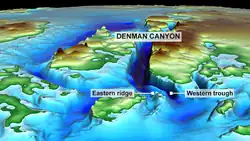 The canyon under Denman Glacier has been found by the BedMachine Antarctica project (under the leadership of the University of California, Irvine)[2] to be the deepest natural location on land (or at least not under liquid water) worldwide, with the bedrock being 3,500 m (11,500 ft) below sea level.[3][4]