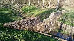 Frequently the inflow area is constructed to protect the structure from some types of damage. Offset concrete blocks in the entrance spillways are used to reduce the speed of entering flood water. These structures may also have debris drop vaults to collect large rocks. These vaults are deep holes under the entrance to the structure. The holes are wide enough to allow large rocks and other debris to fall into the holes before they can damage the rest of the structure. These vaults must be emptied after each storm event.[5]