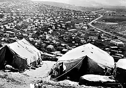 Dheisheh (Arabic: مخيم الدهيشة) is a Palestinian refugee camp located just south of Bethlehem in the West Bank. Dheisheh was established in 1949 on 0.31 square kilometers of land leased from the Jordanian government.[2] The camp was established as a temporary refuge for 3,400 Palestinians from 45 villages west of Jerusalem and Hebron displaced in the 1948 Palestinian expulsion and flight which occurred during the 1948 Palestine war. The camp had a population of 8,805 in 2017.[1]
