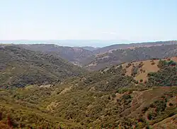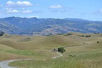 The Diablo Range extends from the Carquinez Strait in the north to Orchard Peak and Polonio Pass in the south, near the point where State Route 46 crosses over the Coast Ranges at Cholame, as described by the United States Geological Survey (USGS). It is bordered on the northeast by the San Joaquin River, on the southeast by the San Joaquin Valley, on the southwest by the Salinas River, and on the northwest by the Santa Clara Valley and San Francisco Bay.[1] On USGS maps, the "Diablo Range" is shown as the ridgeline which runs between its namesake Mount Diablo southeastward past Mount Hamilton. However, the USGS Geographic Names Information System (GNIS) includes the East Bay Hills in its list of various GPS coordinates for the Diablo Range. Although not formally recognized by USGS GNIS, the East Bay Hills consists of the Briones Hills[2] furthest north, then the Berkeley Hills,[3] the San Leandro Hills[4] centrally, and Walpert Ridge[5] and Pleasanton Ridge[6] to the southwest and southeast, culminating at Alameda Creek/Highway 84.