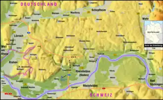 ![]() Dinkelberg between Wiese valley in the northwest and north, the Wehra valley in the east and the Rhine valley in the south and southwest | |