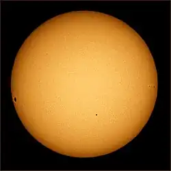 The Sun photographed through a telescope with special solar filter. Sunspots and limb darkening can be clearly seen. Mercury is transiting in the lower middle of the Sun's face.