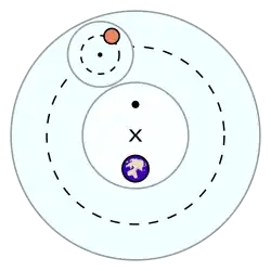 Animation depicting Eudoxus' model of retrograde planetary motion. The two innermost homocentric spheres of his model are represented as rings here, each turning with the same period but in opposite directions, moving the planet along a figure-eight, or hippopedeThe basic elements of Ptolemaic astronomy, showing a planet on an epicycle (smaller dashed circle), a deferent (larger dashed circle), the eccentric (×) and an equant (•).