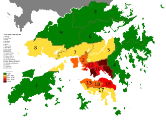 Hong Kong in administration consists of three areas (區域), which was further divided into 18 districts (地區).[11] The three areas are: Hong Kong Island, Kowloon, and the New Territories.[12][13] The New Territories has the most districts (9), followed by Kowloon (5), and lastly Hong Kong Island (4).