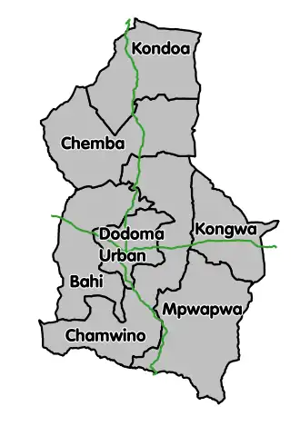 Dodoma region is divided into seven districts, each administered by a council:[21] (Kondoa, Chemba, Bahi, Dodoma, Chamwino, Kongwa, and Mpwapwa), eight local government authorities, 29 divisions, 209 wards, 607 villages, 181 streets, and 2,184 hamlets. Other districts each have a council, however Kondoa district has both Kondoa town council and Kondoa district council.[5]