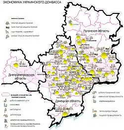 There are numerous definitions of the region's extent.[13] The Encyclopedia of History of Ukraine defines the "small Donbas" as the northern part of Donetsk and the southern part of Luhansk regions of Ukraine, and the attached part of Rostov region of Russia.[14] The historical coal mining region excluded parts of Donetsk and Luhansk oblasts, and included areas in Dnipropetrovsk Oblast and Southern Russia.[9] A Euroregion of the same name is composed of Donetsk and Luhansk oblasts in Ukraine and Rostov Oblast in Russia.[15]