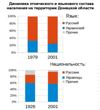 According to the 2001 census, ethnic Ukrainians form 58% of the population of Luhansk Oblast and 56.9% of Donetsk Oblast. Ethnic Russians form the largest minority, accounting for 39% and 38.2% of the two oblasts respectively.[99] In the present day, the Donbas is a predominately Russophone region. According to the 2001 census, Russian is the main language of 74.9% of residents in Donetsk Oblast and 68.8% in Luhansk Oblast.[100]