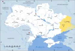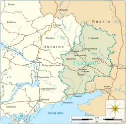 The Donbas (UK: /dɒnˈbɑːs/,[3] US: /ˈdɒnbɑːs, dʌnˈbæs/;[4][5] Ukrainian: Донбас [donˈbɑs][6]) or Donbass (Russian: Донбасс [dɐnˈbas])[7] is a historical, cultural, and economic region in eastern Ukraine.[8][9] The majority of the Donbas is occupied by Russia as a result of the Russo-Ukrainian War.[10][11][12]
