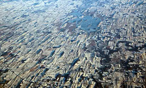 Drumlins around Horicon Marsh, Wisconsin, in an area with one of the highest concentration of drumlins in the world. The curved path of the Laurentide Ice Sheet is evident in the orientation of the various mounds.